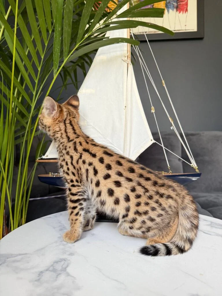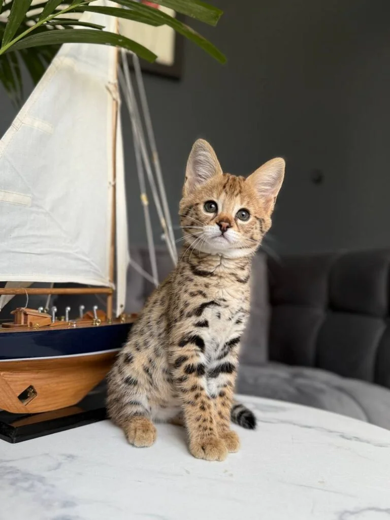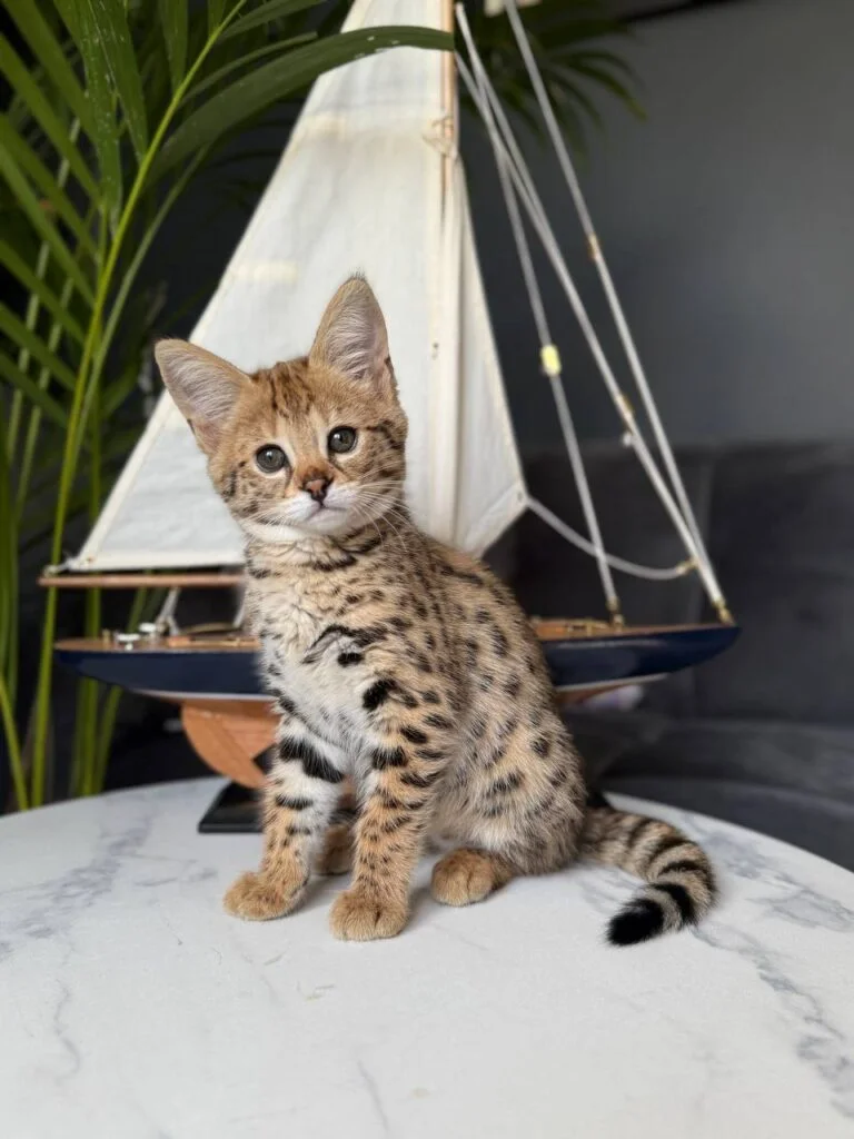 Introducing Aurora, a rare and radiant F1 High-Percentage (PH) Savannah female. Aurora is not simply a feline; she is a testament to the beauty of specialized breeding. With a coat that glows with golden warmth and ink-black spots as sharp as a desert shadow, she is the embodiment of the “Aurora” namesake—a natural wonder in your own home.At 3 months old, Aurora is already exhibiting the legendary Savannah “stilt-walk”—the long-legged, graceful gait inherited from her Serval ancestors. She is for the keeper who demands the very best in aesthetics, lineage, and temperament.
